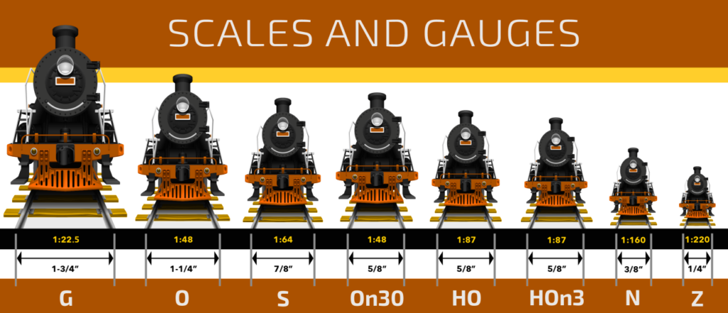 - Four railroad scales—1:24 or 1:25 (G scale), 1:64 (S Scale), 1:87 (HO scale), and 1:160 (N scale*).